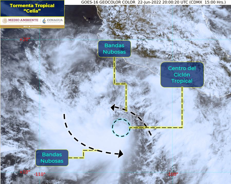 La tormenta tropical “Celia” se localiza frente a las costas de Michoacán y Guerrero. Sus extensas bandas nubosas, en interacción con un canal de baja presión y con la onda tropical número 6, ocasionan lluvias de muy fuertes a puntuales torrenciales en entidades del occidente, sur y sureste del país.