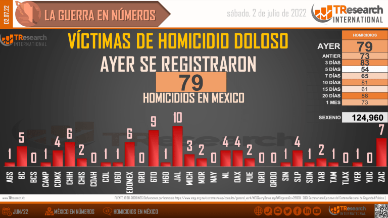 CIUDAD DE MÉXICO.- El reporte ‘MX: La Guerra en Números’, de T-ResearchMX, detalla que, de acuerdo con el registro de homicidios dolosos de la Secretaría de Seguridad y Protección Ciudadana, del 1 de diciembre de 2018 al 25 de junio de 2022, tiempo que lleva la actual Administración del presidente Andrés Manuel López Obrador, las fiscalías estatales y federales han registrado 124 mil 960 homicidios dolosos en México.
