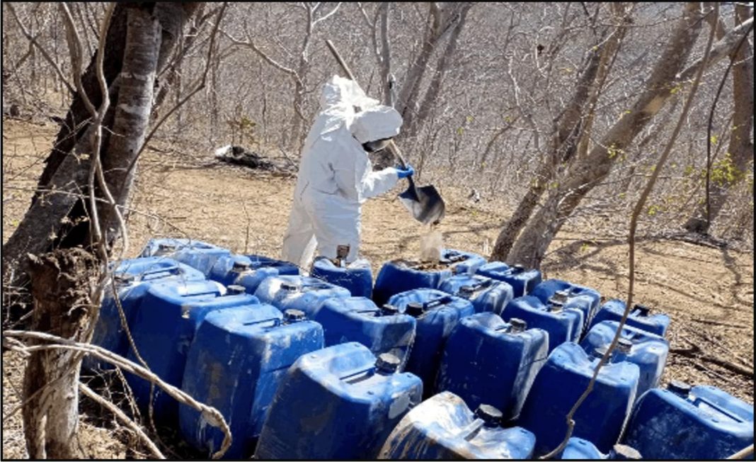 El Gabinete de Seguridad Federal dio a conover que en esta acción aseguraron 1,050 litros de precursores químicos líquidos, 210 kilogramos de químicos esenciales, cinco destiladores y material diverso.