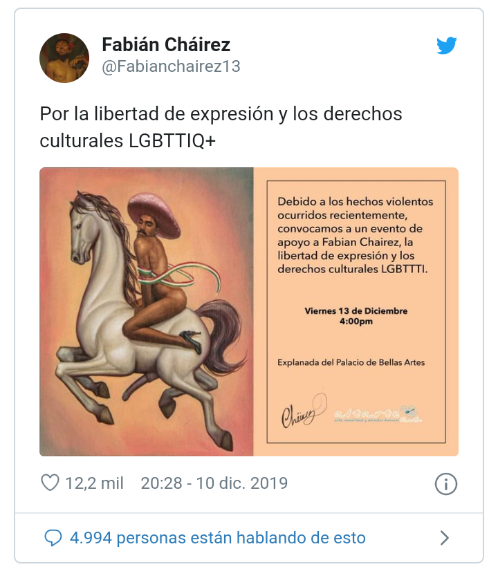 Bajo este discurso, el cuadro del pintor Fabián Chairez (Chiapas, 1987) titulado La Revolución, representa al líder Emiliano Zapata desnudo, montado sobre un caballo, con zapatos de tacón y sombrero charro de color rosa.