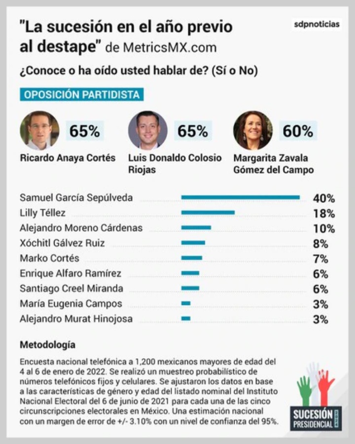 CIUDAD DE MÉXICO.- La casa encuestadora MetricsMX presenta los resultados de la encuesta ‘La sucesión en el año previo al destape’, en el que se estudiaron las preferencias en la intención del voto de la población en México.