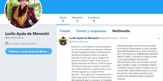 En su cuenta de Twitter, Ayala de Moreschi mostró una carta dirigida al presidente Andrés Manuel López Obrador en la que advierte temer por su vida acusando que cuatro magistrados serán destituidos de la misma manera.