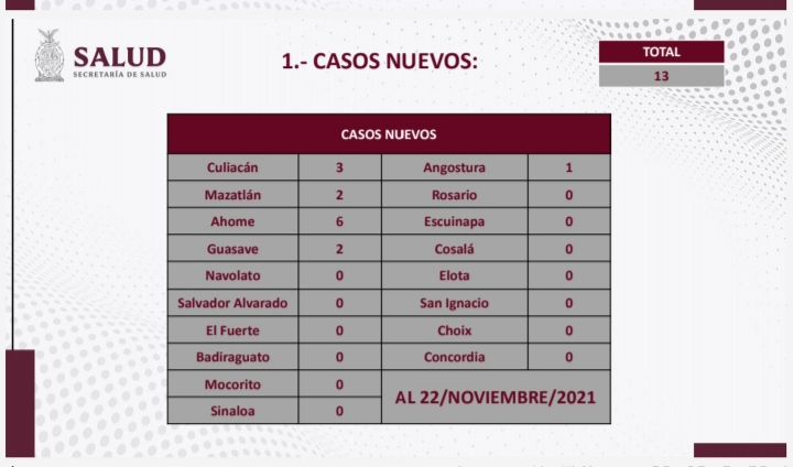 CULIACÁN, Sin.- Sinaloa registró este lunes por segundo día consecutivo cero fallecidos por coronavirus con 13 nuevos casos, informó la Secretaría de Salud.