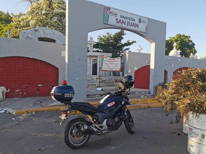 CULIACÁN, Sin.- Personal de la Secretaría de Seguridad Pública y Tránsito Municipal realiza recorridos para verificar el cumplimiento del cierre de panteones municipales, medida implementada para evitar se incremente el número de contagios den de coronavirus en nuestro municipio.