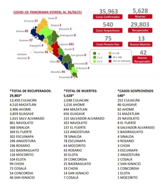 CULIACÁN, Sin.- Hay 13 nuevos fallecimientos reportados en las últimas 24 horas acumulándose 5,628 decesos por COVID-19, informó la Secretaría de Salud.