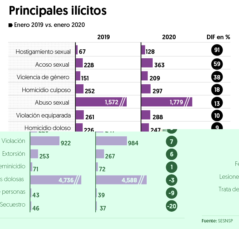 Mientras que el delito de hostigamiento sexual creció 91 por ciento durante enero de 2020, con relación a enero de 2019. Y es que en enero pasado se iniciaron 128 carpetas y un año atrás fueron 67.