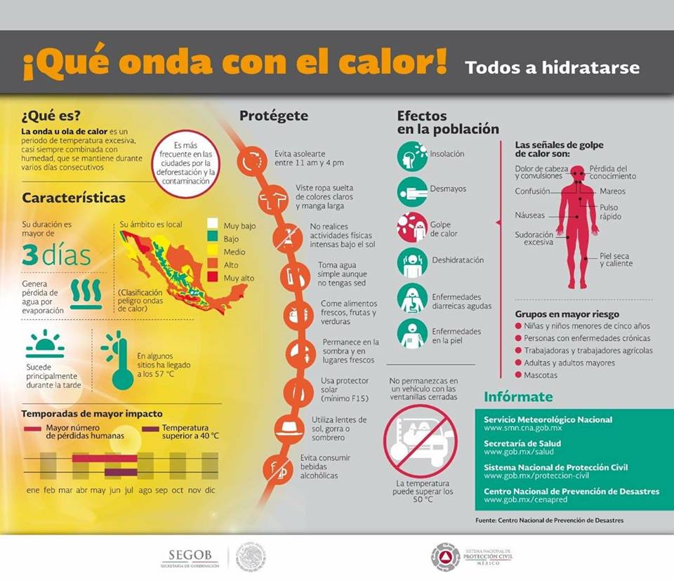 Marco Antonio Juárez Salgueiro, titular de Protección Civil en Navolato, llamó a la población a mantenerse a la sombra, beber agua natural y cuidar de los niños y los adultos mayores, como el segmento de la población más sensible a este tipo de recaídas.