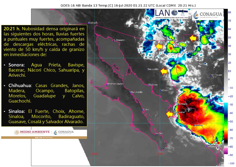 Se esperan en las próximas dos horas, a partir de las 19:20 horas del Pacífico norte, descargas eléctricas, rachas de viento de hasta 50 kilómetros por hora y caída de granizo.