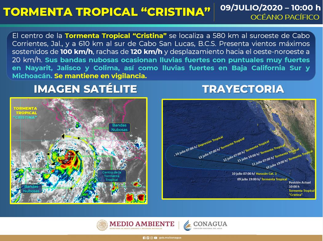 A las 10:00 horas del centro de México, la #TormentaTropical #Cristina se ubica a 580 km al suroeste de Cabo Corrientes, #Jalisco y a 610 km al sur de Cabo San Lucas, #BajaCaliforniaSur.