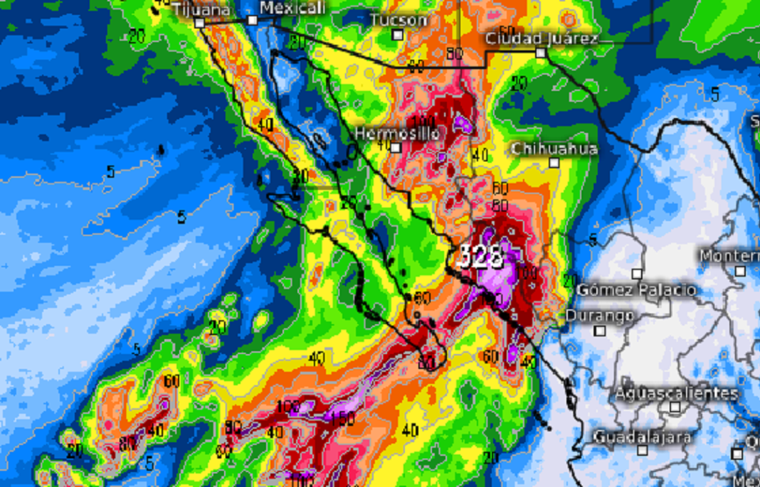 Se estiman lluvias intensas desde mañana hasta el próximo jueves que van de muy fuertes a puntuales intensas (75 a 150 litros por metro cuadrado) en Sonora, Baja California Sur, Chihuahua, Durango y Sinaloa.
