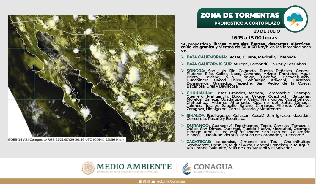 CIUDAD DE MÉXICO.- Para esta noche y madrugada de estiman lluvias puntuales intensas en Sinaloa y otras seis entidades del noroeste del país.