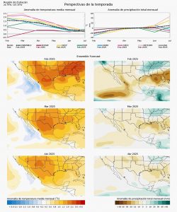 Precisó que las gráficas muestran en primer lugar las temperaturas que se esperan y las precipitaciones hasta el mes de julio, detallando que las gráficas de la República Mexicana, en el lado izquierdo son la estimación de temperaturas y en el derecho las anomalía de lluvias, en la cual se observa que no tenemos lluvias en toda la región noroeste.