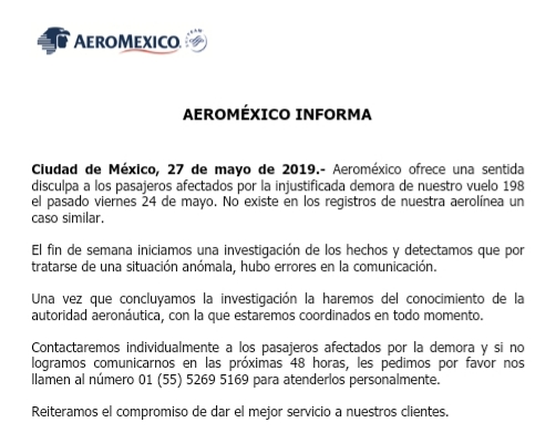 CIUDAD DE MÉXICO.- A través de un comunicado, la empresa Aeroméxico extendió una disculpa a los pasajeros afectados por el retraso del vuelo 198 el pasado viernes 24 de mayo a Mexicali, y que provocó la renuncia de Josefa González a la Semarnat.