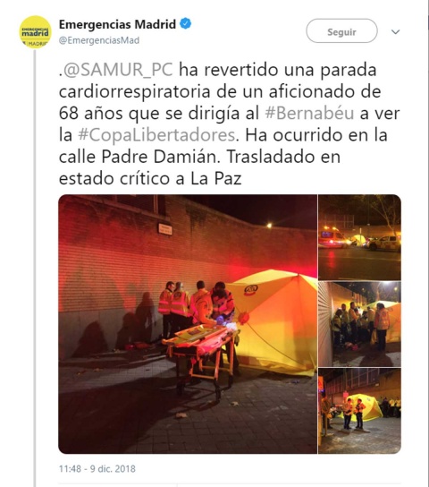Samur ha revertido una parada cardiorrespiratoria de un aficionado de 68 años que se dirigía al Bernabéu a ver la Copa Libertadores. Ha ocurrido en la calle Padre Damián. Trasladado en estado crítico a La Paz”, informó el Samur.