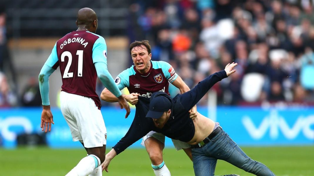 Luego de que cayera el primer gol de la visita al minuto 66, un grupo de aficionados ingresó al terreno del campo para encarar a los futbolistas de los Hammers.