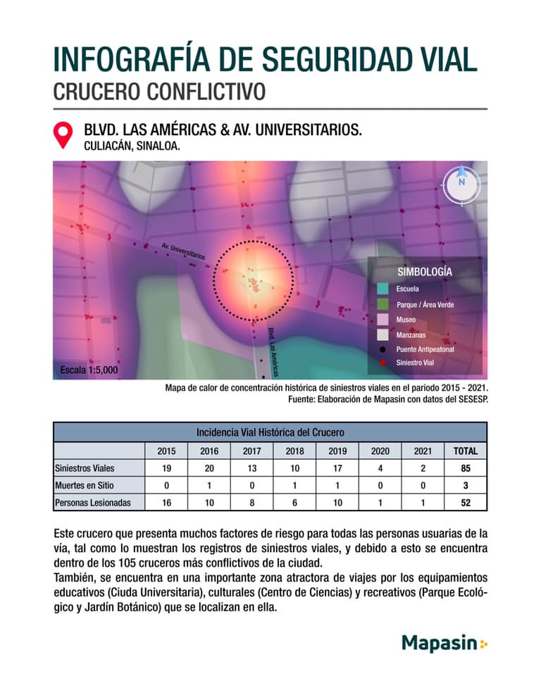 Presenta grandes factores de riesgo para las y los usuarios de la vía. Se encuentra en una zona atractora de viajes y actualmente está en proceso de remodelación para volverse un crucero seguro.