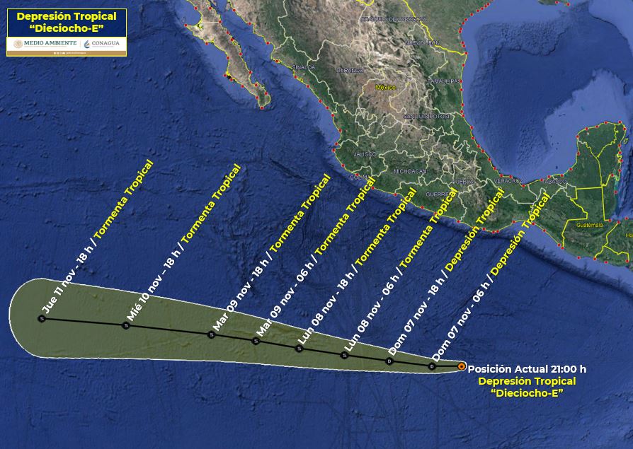 Se ubica a 950 km al sur-suroeste de Salina Cruz, Oaxaca y a 965 km al sur de Acapulco, Guerrero y apunta hacia el oeste a 20 km/h con vientos sostenidos de 55 km/h y rachas: 75 km/h.