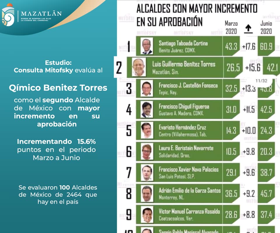 CIUDAD DE MÉXICO.- El presidente municipal de Mazatlán, Luis Guillermo Benitez Torres, se posiciona como el segundo mejor alcalde de México con mayor incremento en su aprobación.