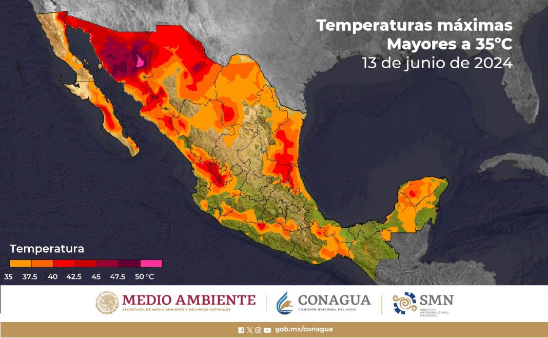Finalmente, continuará el ambiente vespertino caluroso a muy caluroso en gran parte de la República Mexicana, con temperaturas máximas extremadamente calurosas, superiores a los 45 °C, en zonas de Baja California y Sonora.