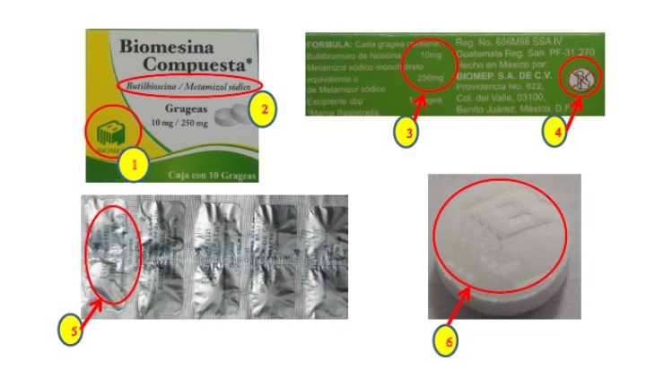 El titular de la Coepriss explicó que la Comisión Federal para la Protección contra Riesgos Sanitarios ha realizado una investigación a partir de la denuncia presentada por la empresa BIOMEP S.A. de C.V., por la falsificación del producto Biomesina Compuesta (Butilhioscina / Metamizol sódico) 10 mg / 250 mg, caja con 10 grageas y Registro Sanitario 606M98 SSA IV.
