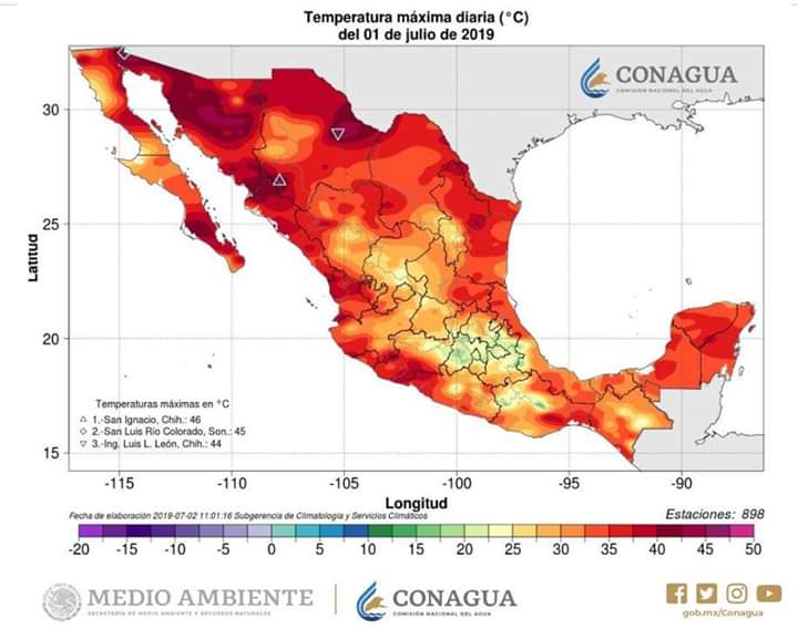 El siguiente mapa de México muestra las temperaturas máximas registradas el día de ayer lunes 1 de julio.