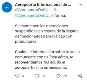 CULIACÁN, Sin.- Debido a la presencia de manifestantes, el Aeropuerto de Culiacán anunció este miércoles que se mantienen las operaciones suspendidas en espera de la llegada de funcionarios para diálogo con productores.