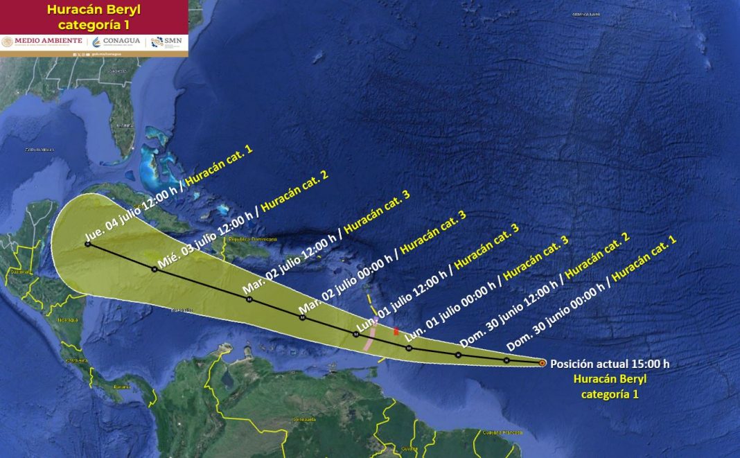 CIUDAD DE MÉXICO.- La tormenta tropical Beryl se ha intensificado a huracán de categoría 1 en la escala de Saffir-Simpson, su centro se localiza a más de 4 mil kilómetros al este de las costas de Quintana Roo.