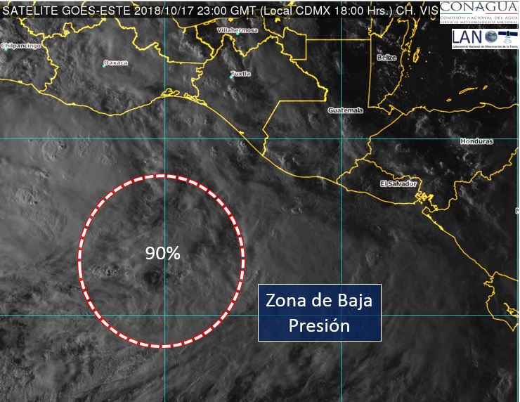 CIUDAD DE MÉXICO.- Zona de baja presión con 90 por ciento de potencial para desarrollo ciclónico en 48 horas se localiza sobre el Golfo de Tehuantepec y favorece el potencial de lluvias intensas a torrenciales en el sureste de México.