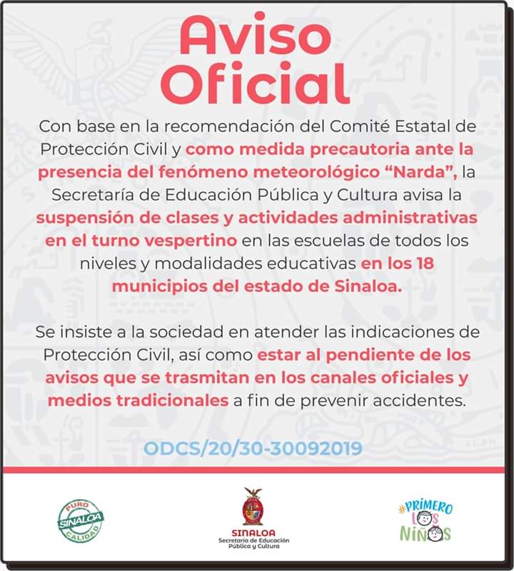 CULIACÁN, Sin.- Se amplió la suspensión de clases para el turno vespertino en las escuelas de todos los niveles y sistemas educativos de los 18 municipios de Sinaloa para este lunes 30 de septiembre, por recomendación del Comité Estatal de Protección Civil.