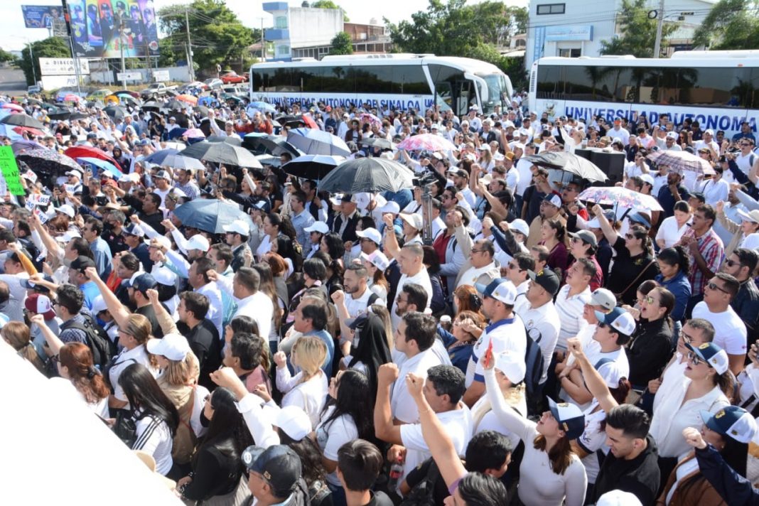 “Desde aquí va nuestro mensaje al señor Gobernador, al Poder Legislativo, al Poder Judicial; no nos vamos a cansar de defender a la Universidad Autónoma de Sinaloa, sepa el diputadillo Feliciano Castro que no somos poquitos, no somos porros, somos universitarios maestros y trabajadores que aquí estamos dando la cara y con la frente en alto para que sepan que vamos a luchar por la autonomía universitaria”, expresó Angela Geraldini Vázquez Millán, directora de la Preparatoria La Cruz, del municipio de Elota.