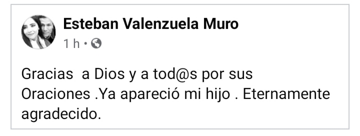 NAVOLATO, Sin.- El exalcalde de Navolato, Esteban Valenzuela Muro, informó la tarde de este jueves que su hijo Édgar Guillermo Valenzuela García ya apareció.