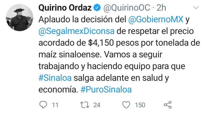 Así lo afirmó a través de su cuenta de Twitter donde asegura que en Sinaloa “vamos a seguir trabajando y haciendo equipo” para que la entidad salga adelante.