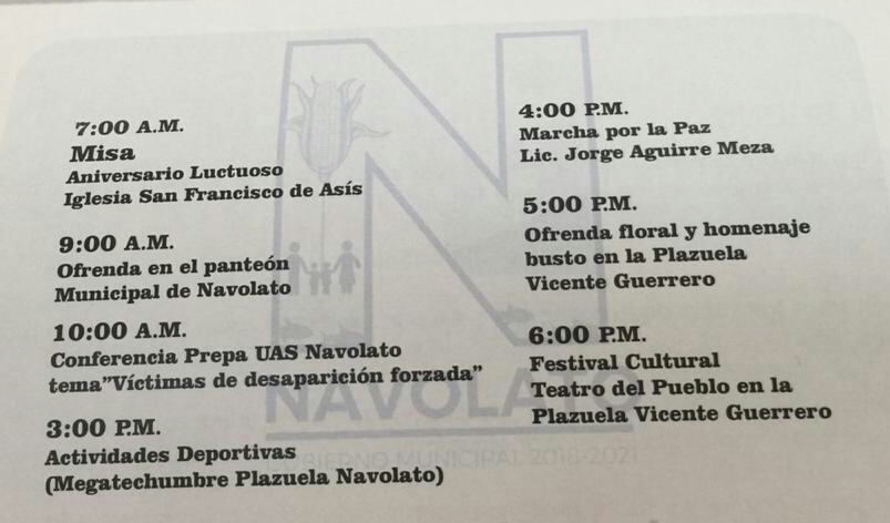 NAVOLATO, Sin.- En el 21 aniversario luctuoso del exregidor Jorge Aguirre Meza se realizará la denominada Jornada contra la Violencia.