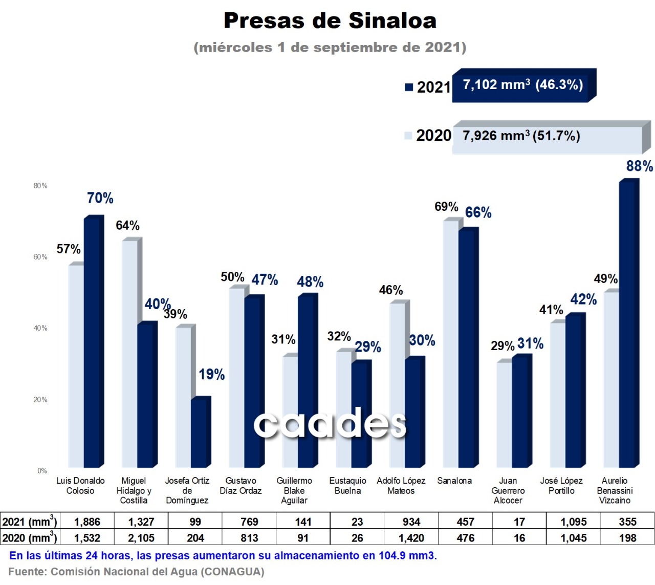 CULIACÁN, Sin.- Este miércoles las presas de Sinaloa tienen 7,102 mm3, lo que indica un aumento de 104.9 mm3 en las últimas 24 horas.