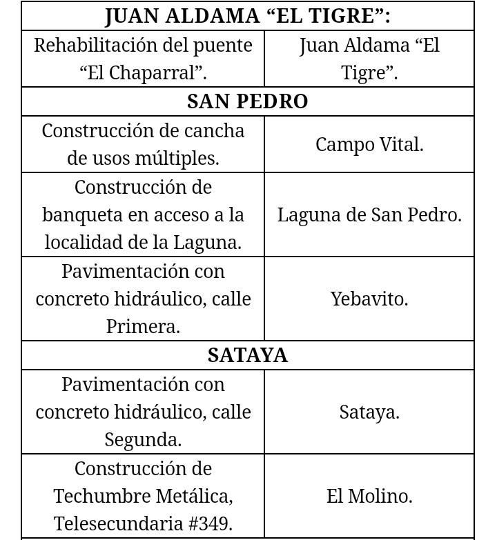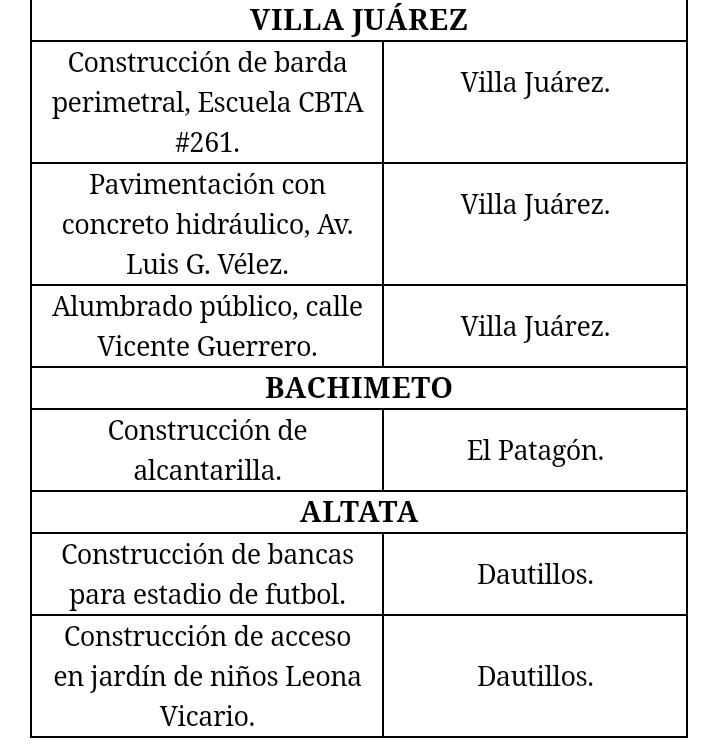 Las obras comprenden desde construcción de bancas hasta pavimentación y están distribuidas en las sindicaturas de Juan Aldama “El Tigre”, San Pedro, Villa Juárez, Sataya, Bachimeto y Altata.