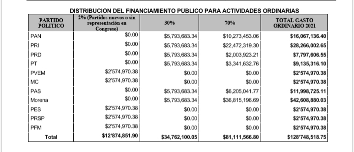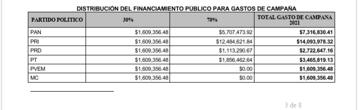 En cuanto al monto del financiamiento público para gastos de campaña en el año 2021, éste será el equivalente al 50 por ciento del financiamiento público para el sostenimiento de las actividades ordinarias permanentes para el año 2021, que da la cifra de 64 millones 374 mil 259.38 pesos.