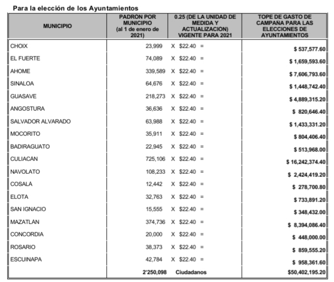 De tal forma, la actualización del monto para el sostenimiento de actividades ordinarias permanentes para el ejercicio 2021 y con fundamento en la Ley de Instituciones y Procedimientos Electorales del Estado de Sinaloa, establece que dicha cantidad resulta de multiplicar el total de ciudadanía inscrita en el Padrón Electoral con fecha de corte al último día del mes de julio de cada año, por el 65 por ciento de la UMA vigente para este año, el cual nos da como resultado 128 millones 748 mil 518.75 pesos.