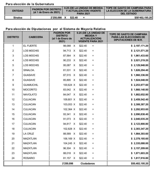 De tal forma, la actualización del monto para el sostenimiento de actividades ordinarias permanentes para el ejercicio 2021 y con fundamento en la Ley de Instituciones y Procedimientos Electorales del Estado de Sinaloa, establece que dicha cantidad resulta de multiplicar el total de ciudadanía inscrita en el Padrón Electoral con fecha de corte al último día del mes de julio de cada año, por el 65 por ciento de la UMA vigente para este año, el cual nos da como resultado 128 millones 748 mil 518.75 pesos.