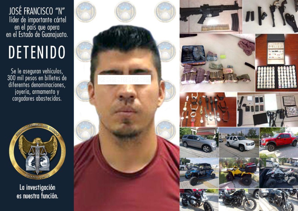 CELAYA, Gto.- La Fiscalía General del Estado (FGE) arrestó en la esta ciudad a un presunto líder del cártel del Golfo que operaba en el estado de Guanajuato. También aseguró armas, vehículos, dinero en efectivo y joyas.