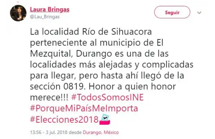Por otra parte, la consejera del Instituto Electoral y de Participación Ciudadana de Durango, Laura Bringas, señaló que la localidad de Río de Sihuacora es una de las más alejadas y complicadas de llegar, pero que gracias al esfuerzo de los ciudadanos llegaron los paquetes.