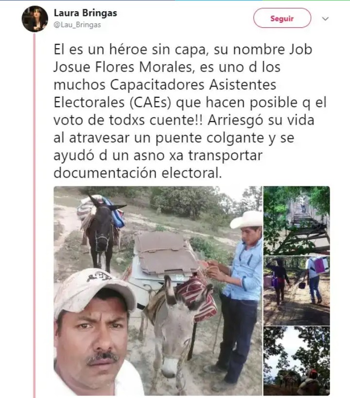 Bringas también compartió fotos de la travesía de uno de los capacitadores electorales para transportar el material electoral. El hombre fue identificado como Job Josué Flores Morales, quien, destacó la consejera, “arriesgo su vida al atravesar un puente colgante y se ayudó de un asno para transportar documentación electoral”.