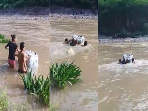 El clip grabado en El Mezquital, Durango, muestra a dos hombres y una mujer sumergiéndose en un río mientras sostienen una caja con los paquetes electorales.