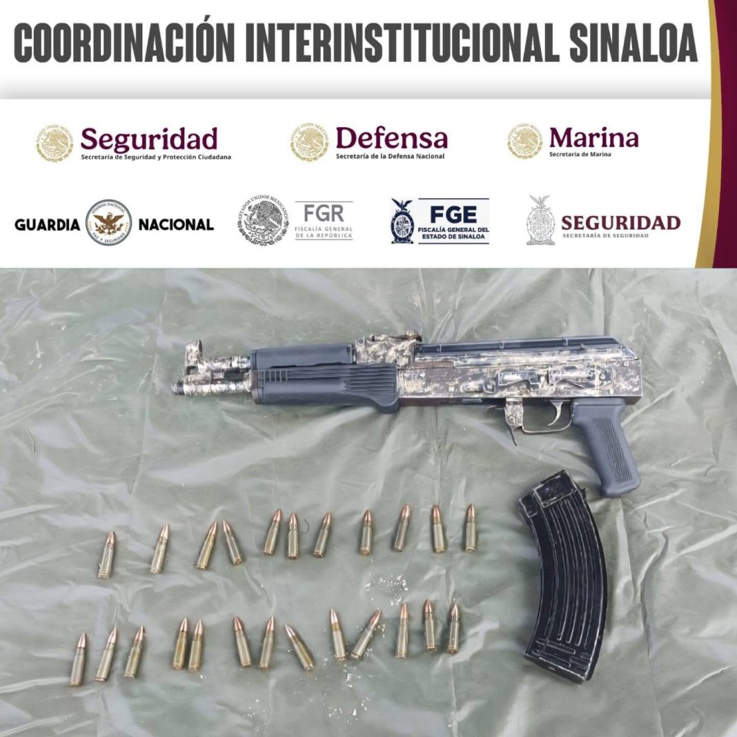 CULIACÁN, Sin.- Personal de la Secretaría de la Defensa Nacional, en coordinación con la Guardia Nacional, la Secretaría de Marina, la Secretaría de Seguridad y Protección Ciudadana, la Fiscalía General de la República, la Fiscalía General del Estado y la Secretaría de Seguridad Pública del Estado, a través de la Policía Estatal Preventiva, aseguró un arma larga, un cargador y cartuchos en Navolato.