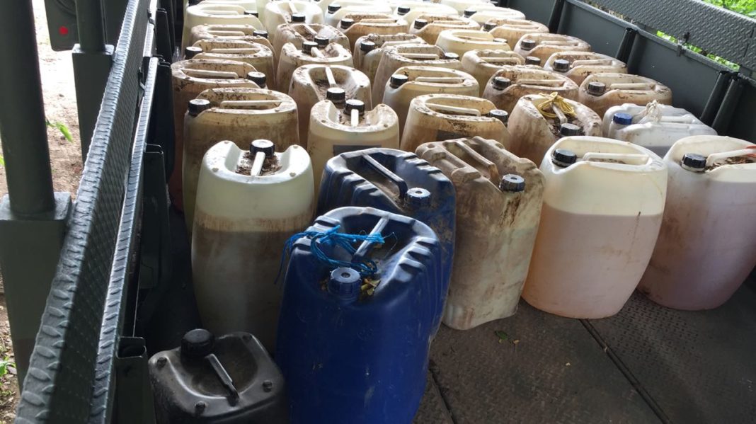 En Mojolo se aseguran 51 bidones de plástico, con capacidad de 50 litros con una sustancia química en estado líquido transparente, con un aproximado de 45 litros cada uno