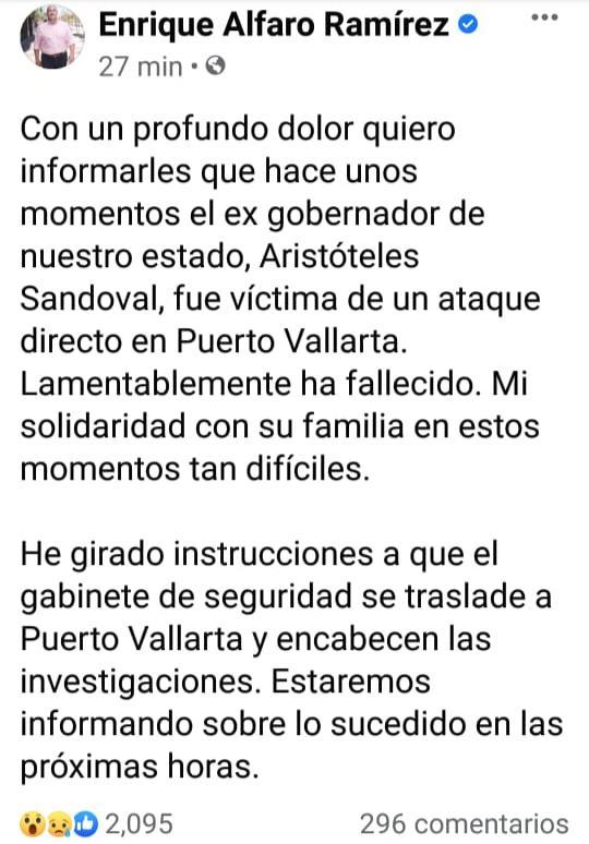 La información fue corroborada por el propio gobernador de Jalisco Enrique Alfaro Ramírez a través de su cuenta de twitter.