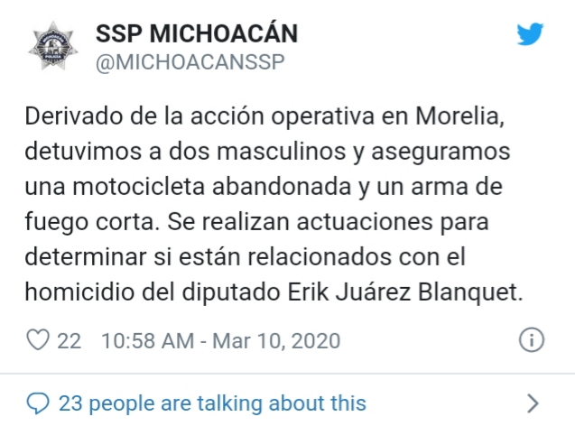En otro tuit, la secretaría dio a conocer lo siguiente, sin confirmar si los detenidos están relacionados con el asesinato: