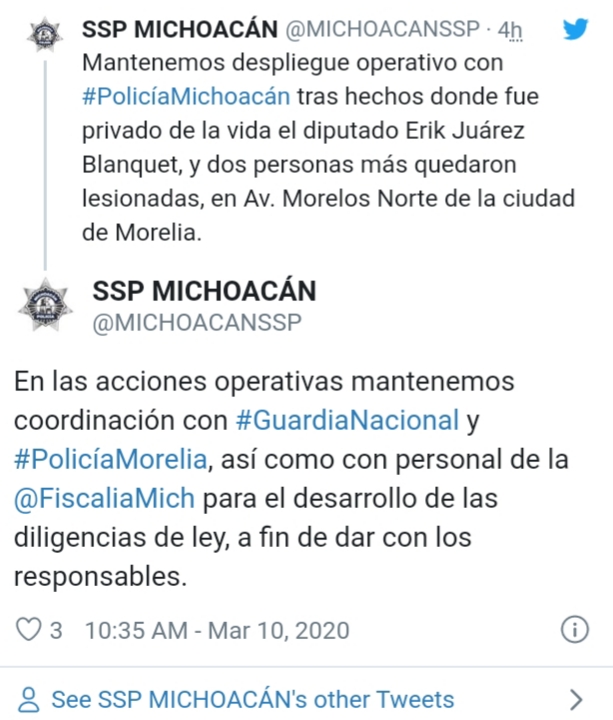 La Secretaría de Seguridad Pública de Michoacán informó que, en los hechos en los que fue privado de la vida el político, “dos personas más quedaron lesionadas, en Av. Morelos Norte de la ciudad de Morelia”.