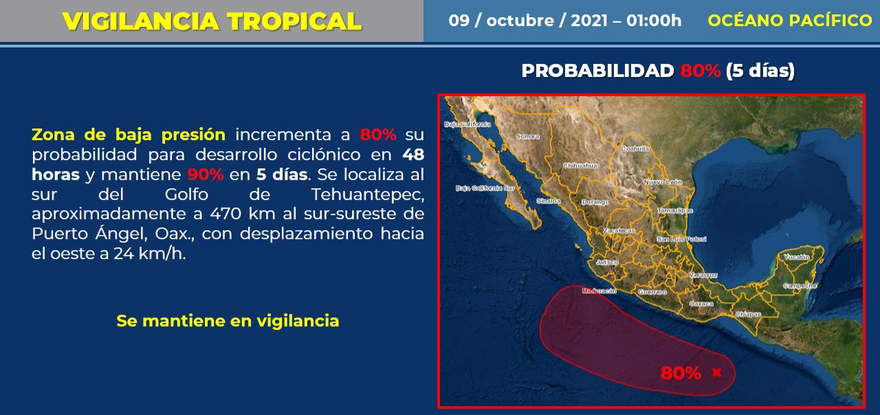CIUDAD DE MÉXICO.- La zona de baja presión con potencial ciclónico sobre el océano Pacífico aumentó a 80% su probabilidad para desarrollar un ciclón tropical en 48 horas.
