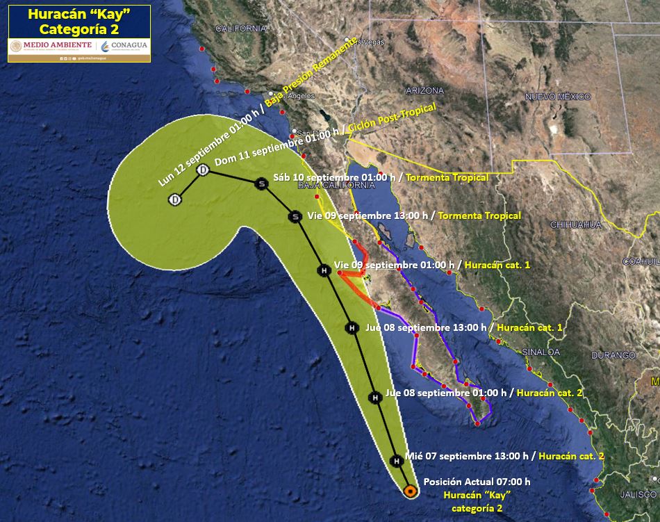 CIUDAD DE MÉXICO.- El centro del huracán “Kay”categoría 2 en la escala de Saffir-Simpson se localiza al suroeste de Baja California Sur y al oeste de las costas de Jalisco, con desplazamiento hacia el nor-noroeste y con trayectoria pronóstico paralela a la costa occidental de la Península de Baja California.