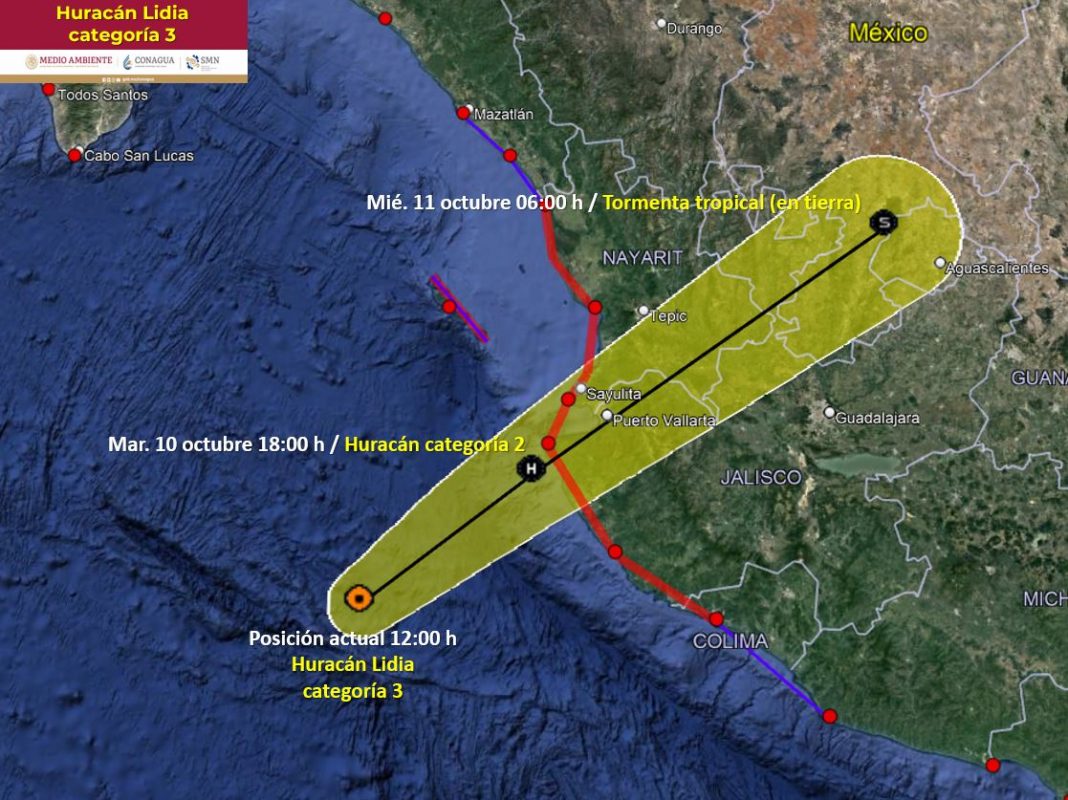 CIUDAD DE MÉXICO.- “Lidia” se ha intensificado rápidamente a huracán de categoría 3 en la escala Saffir-Simpson. Su amplia circulación refuerza las lluvias intensas a puntuales torrenciales en siete estados.